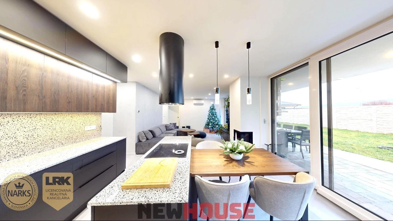 - Kuchyňa vyrobená na mieru od spoločnosti Trenab s pracovnou doskou vyrobenou z kameňa technistone taurus a so zabudovanými spotrebičmi zn.Wirpool ( varná doska, rúra, mikrovlnka, umývčka riadu, kávovar, chladnička s mrazničkou) spojená s obývaciou izbou a výstupom na terasu